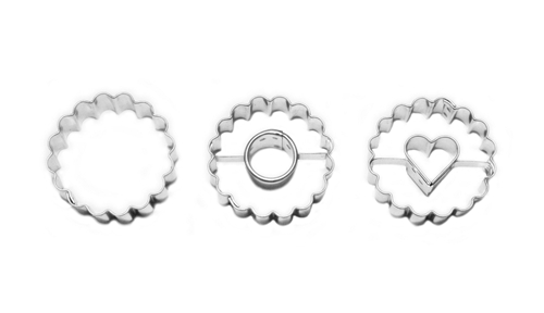 Chcete se letos při pečení cukroví držet tradičních tvarů? Vyzkoušejte naši sadu tří kulatých vykrajovátek (nejen) na linecké složených ze základního zoubkovaného kruhu, vroubkového kruhu s hladkým kruhem uprostřed a zoubkovaného kruhu doplněného o srdíčko ve středu.